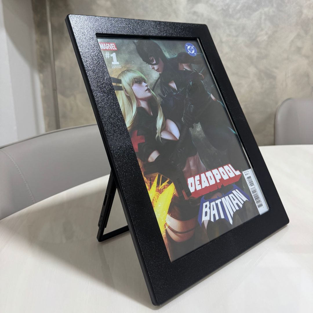 A sleek clip-on frame designed to turn your ComicCapsule into a stunning wall or tabletop display.