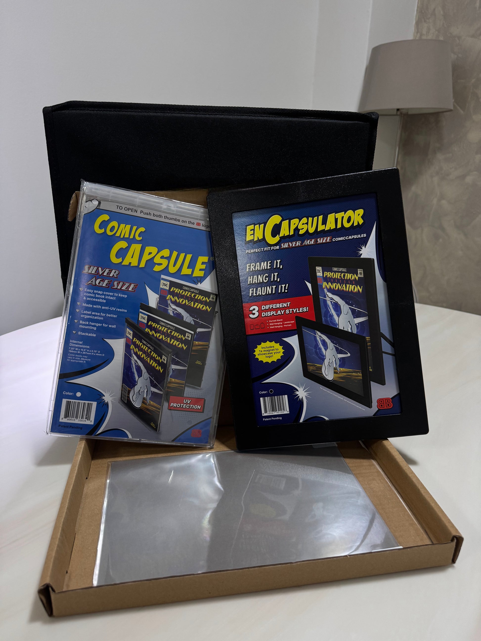 The Encapsulator is the ultimate add-on frame designed to level up your ComicCapsule experience. Crafted specifically for Silver Age ComicCapsules (for now), it instantly transforms your storage case into a sleek tabletop display, upright shelf piece, or wall-mounted art.